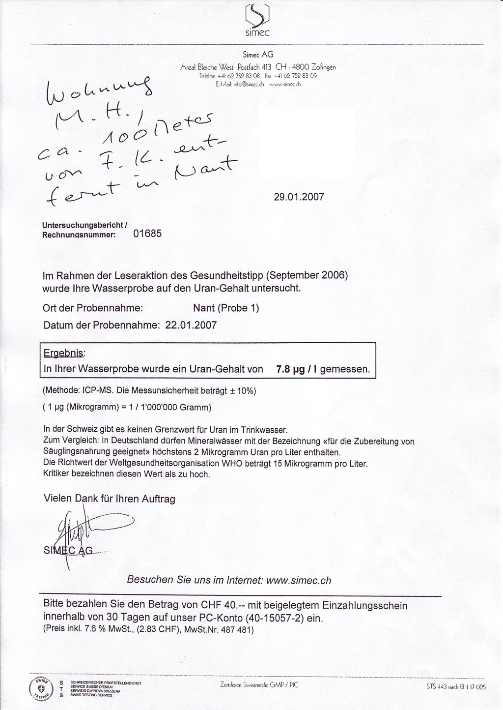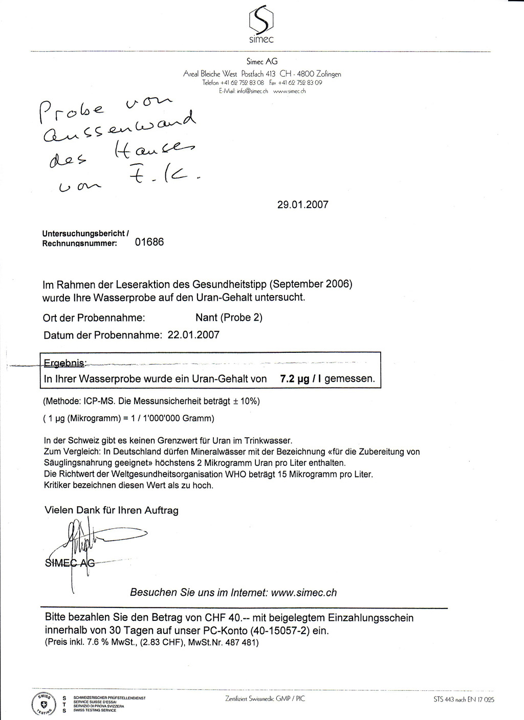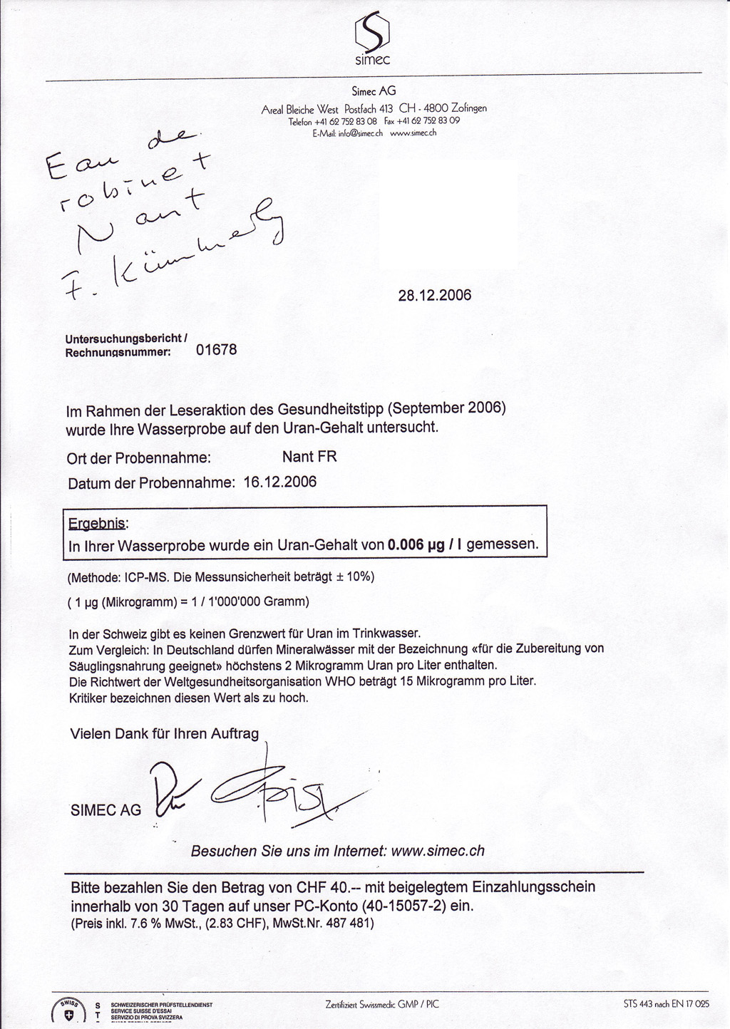 Medienmiteilung über Uraniumgehalt im Wasser Schweizer Kundin läßt darauf hin ihr Wasser auf Urangehalt untersuchen, vor und nach der Nutzung des Gie-Wasseraktivators